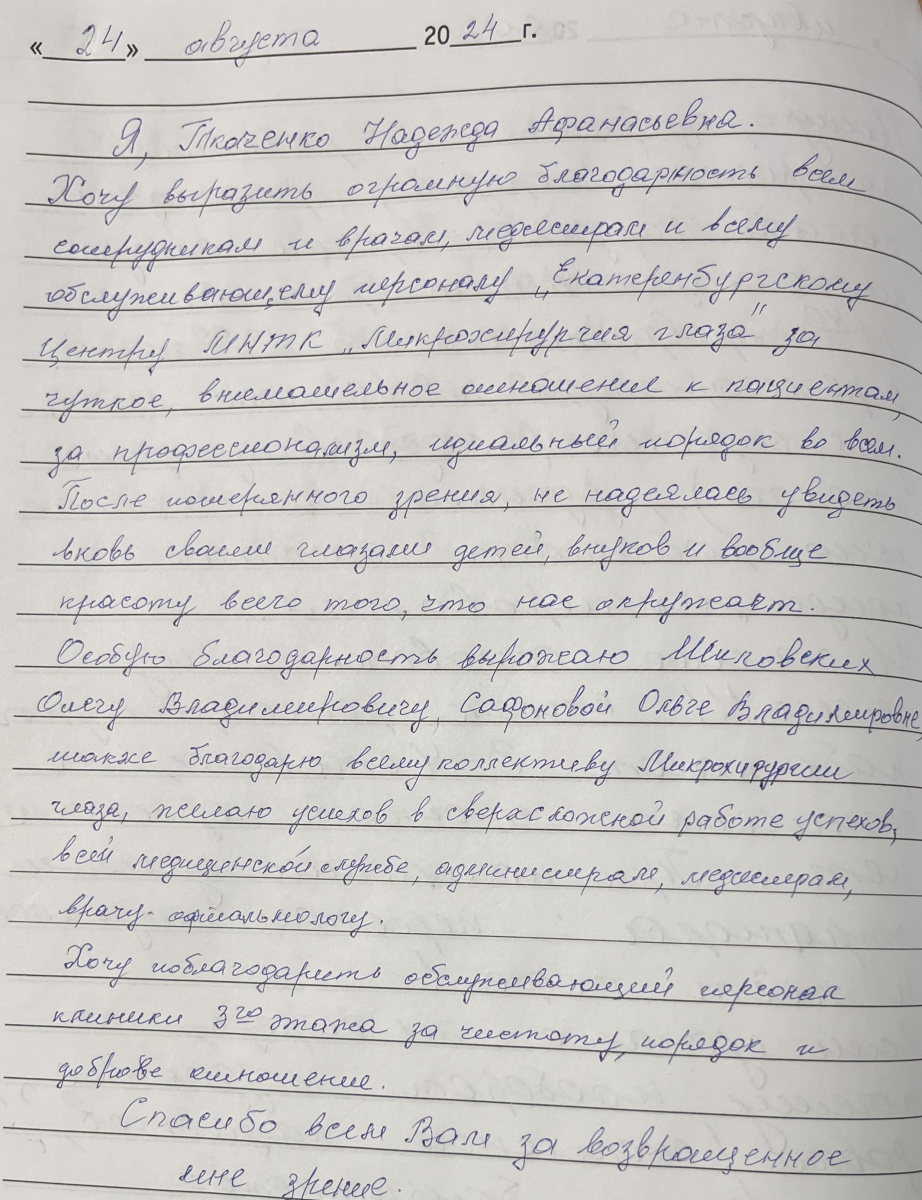 В данном разделе вы можете оставить свой отзыв об Екатеринбургском центре МНТК "Микрохирургия глаза" и ознакомиться с другими отзывами о нас.